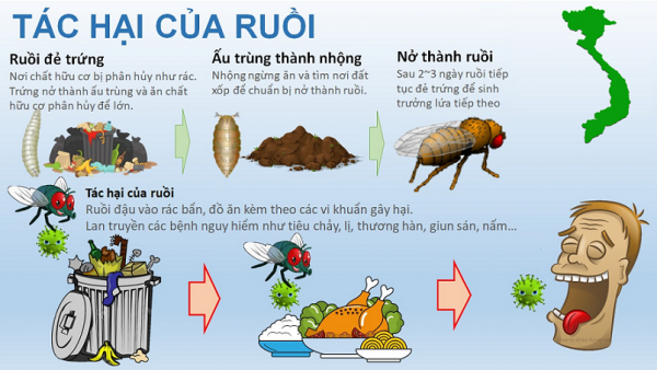Ruồi không trực tiếp truyền bệnh vào cơ thể người và vật, chúng là trung gian mang mầm bệnh vào nguồn nước, thực phẩm của chúng ta dẫn đến những bệnh nguy hiểm. Hiện nay, mật độ ruồi dày đặc hơn do sự ô nhiễm môi trường, ý thức giữ vệ sinh cộng đồng kém.